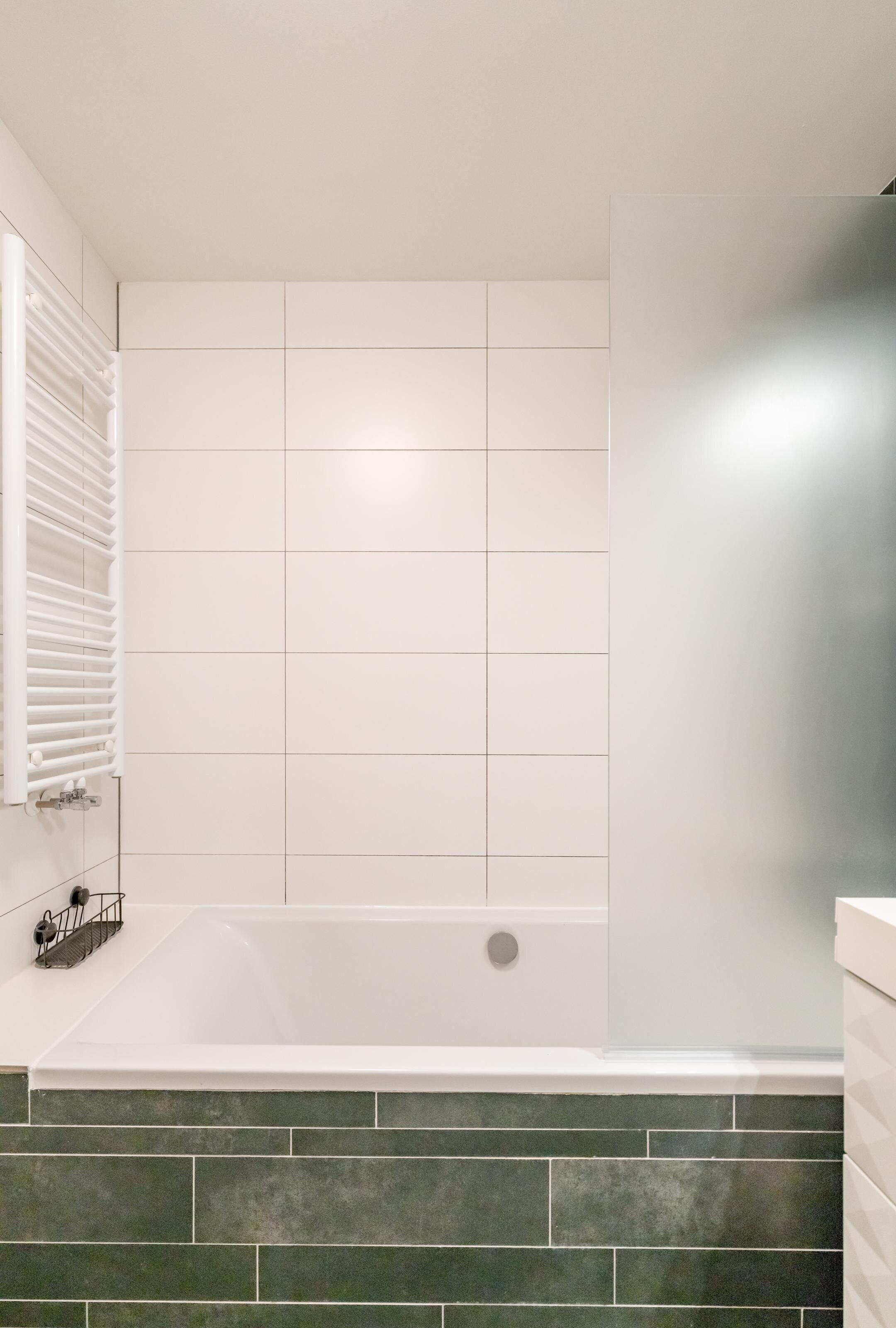 The fully tiled bathroom is modern and equipped with underfloor heating, a bathtub with shower screen, a double washbasin, a second toilet and a design radiator. Additionally, there is a separate guest toilet in the same style, also equipped with underfloor heating.