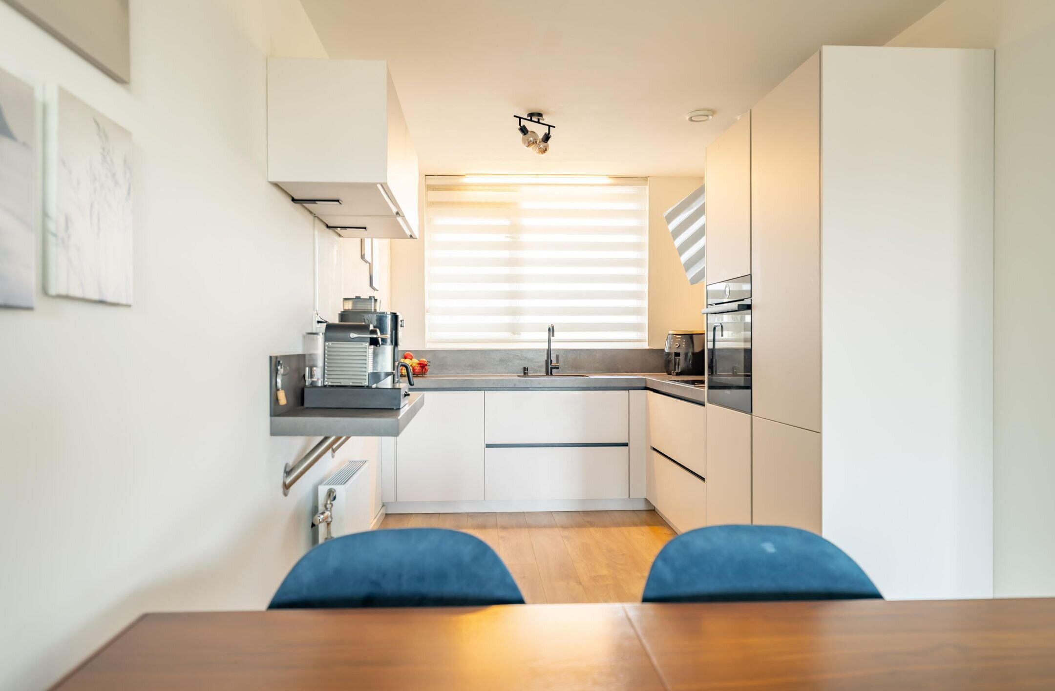 The semi-open kitchen is designed in a practical corner layout and equipped with built-in Bosch appliances (approx. 5 years old), including an oven and dishwasher. Also a built-in fridge-freezer. An additional worktop with upper cabinets on the opposite side provides extra storage and is perfect for a coffee station.